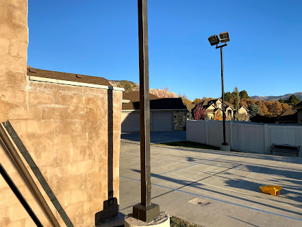 vi hældte også konkrete søjler og monteret 20′ parkeringsplads stil poler. Derefter tilføjede halogenarmaturer (jeg vil bytte dem ud for LED snart) for at få 100 fodlys af lys i spilleområdet. Det er som om Solen er i retten 🙂