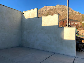 væggen blev belagt med en overfladebindende cement med mudret flodfarvestof tilsat for at komplimentere husets farve (naboens skur støder op til retten)